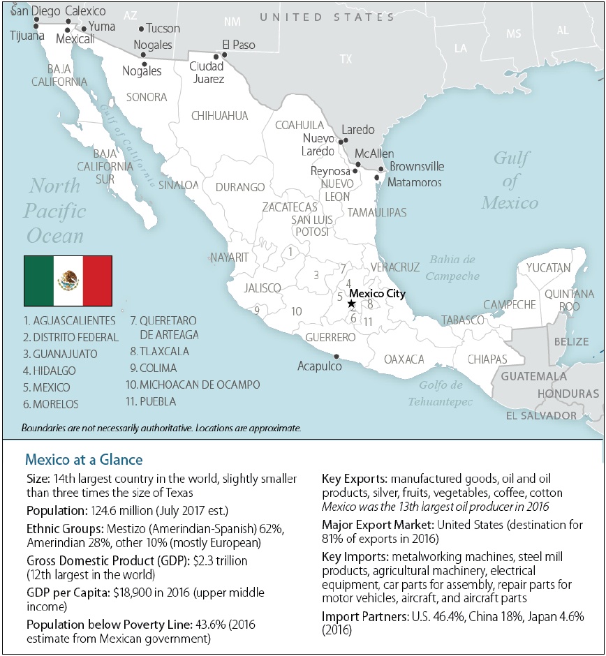 Over the past year, Congress has demonstrated renewed interest in Mexico, a top trade partner and energy supplier with which the United States shares a nearly 2,000-mile border and strong cultural, familial, and historical ties (see Figure 1). Economically, the United States and Mexico are very interdependent, and U.S. policymakers are closely following efforts to renegotiate the North America Free Trade Agreement (NAFTA) that began in August 2017. |1| Similarly, security conditions in Mexico affect U.S. national security, particularly along the U.S.-Mexican border. |2| Observers are concerned about resurgent organized crime-related violence in Mexico, which reached record levels in 2017 (see Figure 2). |3|