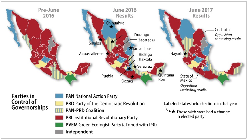 The last major elections before the 2018 presidential contest took place on June 4, 2017. Those elections included gubernatorial contests in the state of Mexico (President Peña Nieto's home state), Nayarit, and Coahuila. The PRI won in Coahuila and in the state of Mexico. The PRI's relatively narrow margin of victory over the MORENA candidate (less than 3%) in the state of Mexico may not bode well for the party's prospects in the 2018 elections.