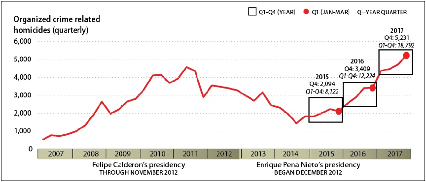 President Peña Nieto campaigned on a promise to reduce violence in Mexico. However, five years later, insecurity has risen sharply (see Figure 2). Organized crime-related homicides in Mexico rose slightly in 2015 and significantly in 2016. |8| In 2017, total homicides and organized crime-related homicides reached record levels. |9| The State Department has warned Americans not to travel to 5 of Mexico's 32 states and to reconsider whether to travel to another 11 states. |10| There are already concerns about election-related violence, particularly in Guerrero (where several politicians have already been killed). |11|