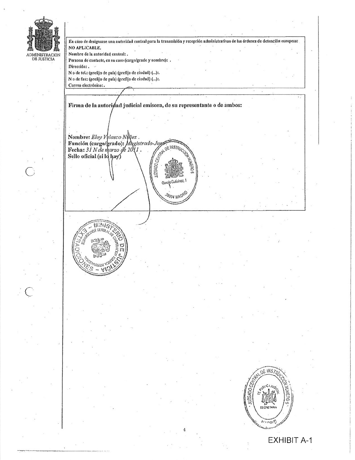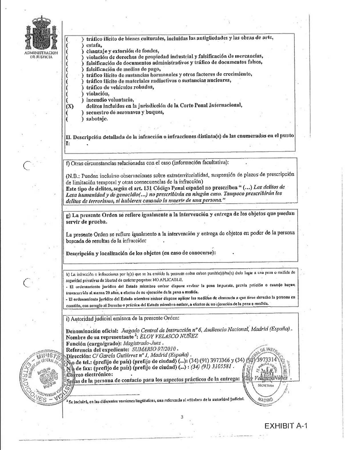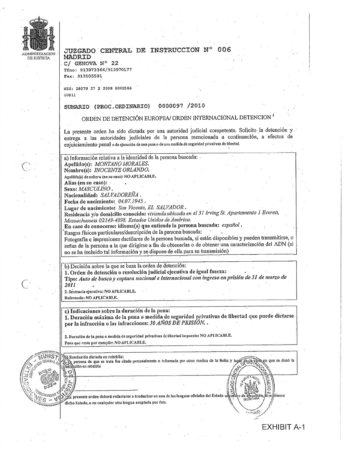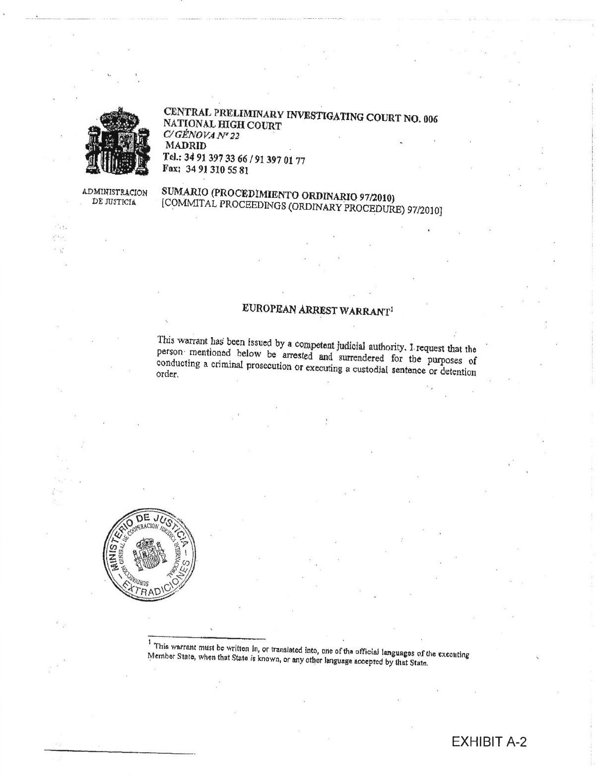 5. Foreign Arrest Warrant. A warrant for the arrest of MONTANO MORALES was issued in Spain on March 31, 2011. This warrant, a copy of which is attached as Exhibit A-l to this Complaint, remains outstanding. An English translation of the warrant is attached as Exhibit A-2.