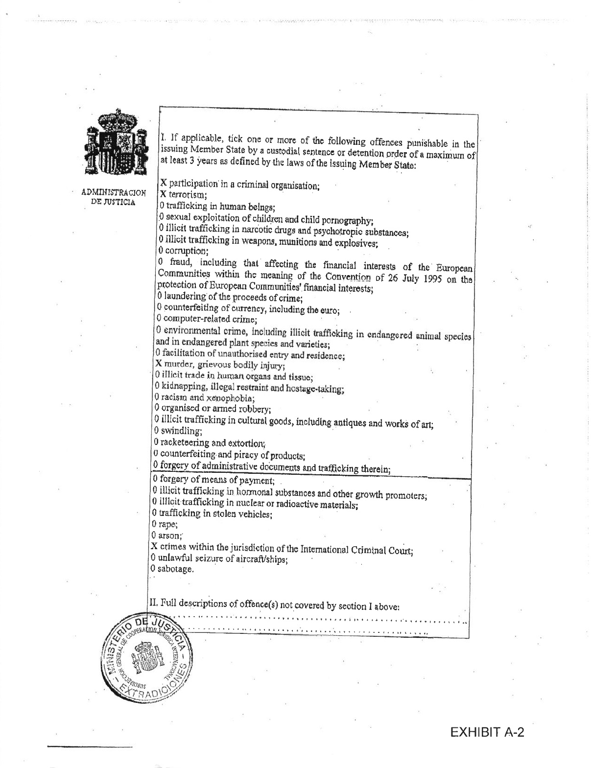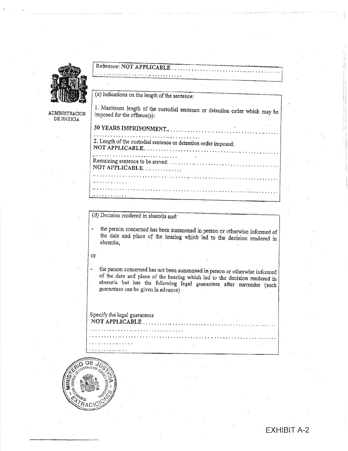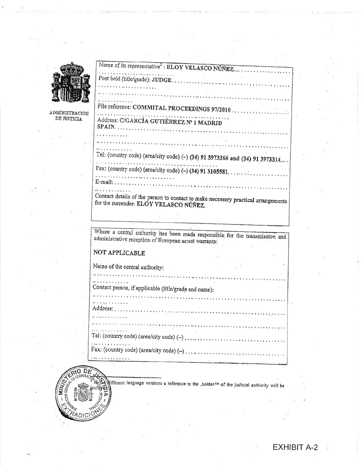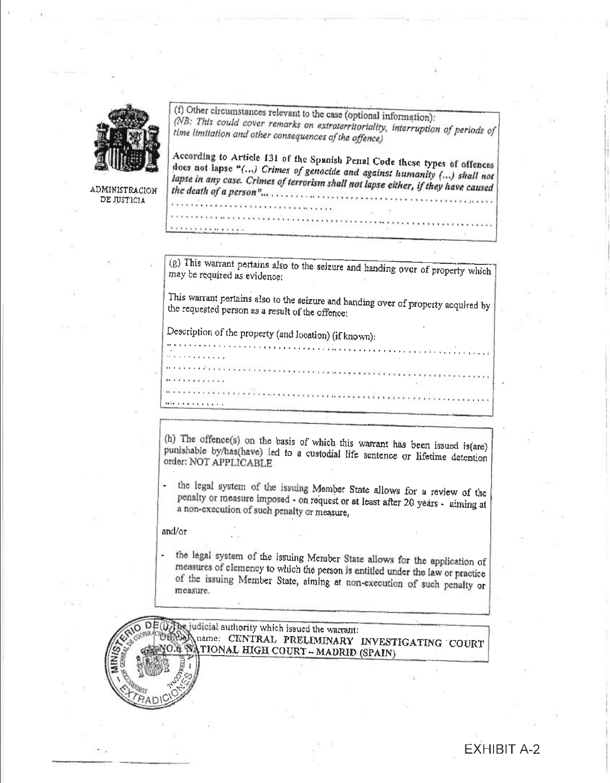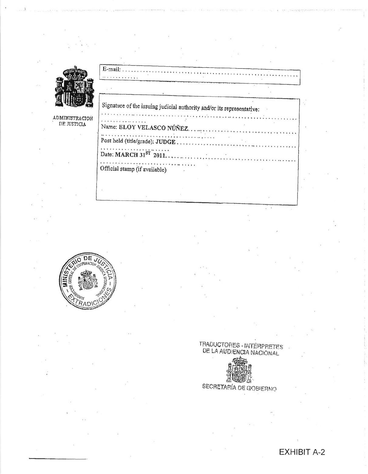 5. Foreign Arrest Warrant. A warrant for the arrest of MONTANO MORALES was issued in Spain on March 31, 2011. This warrant, a copy of which is attached as Exhibit A-l to this Complaint, remains outstanding. An English translation of the warrant is attached as Exhibit A-2.