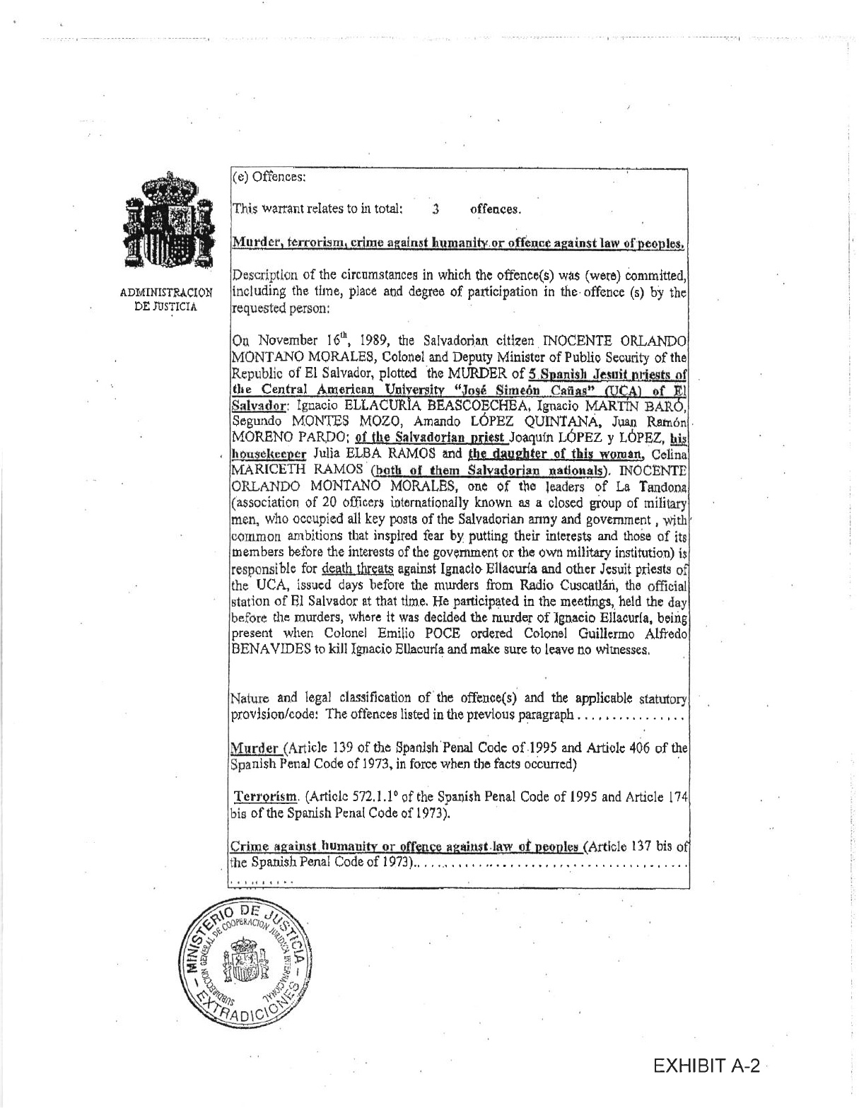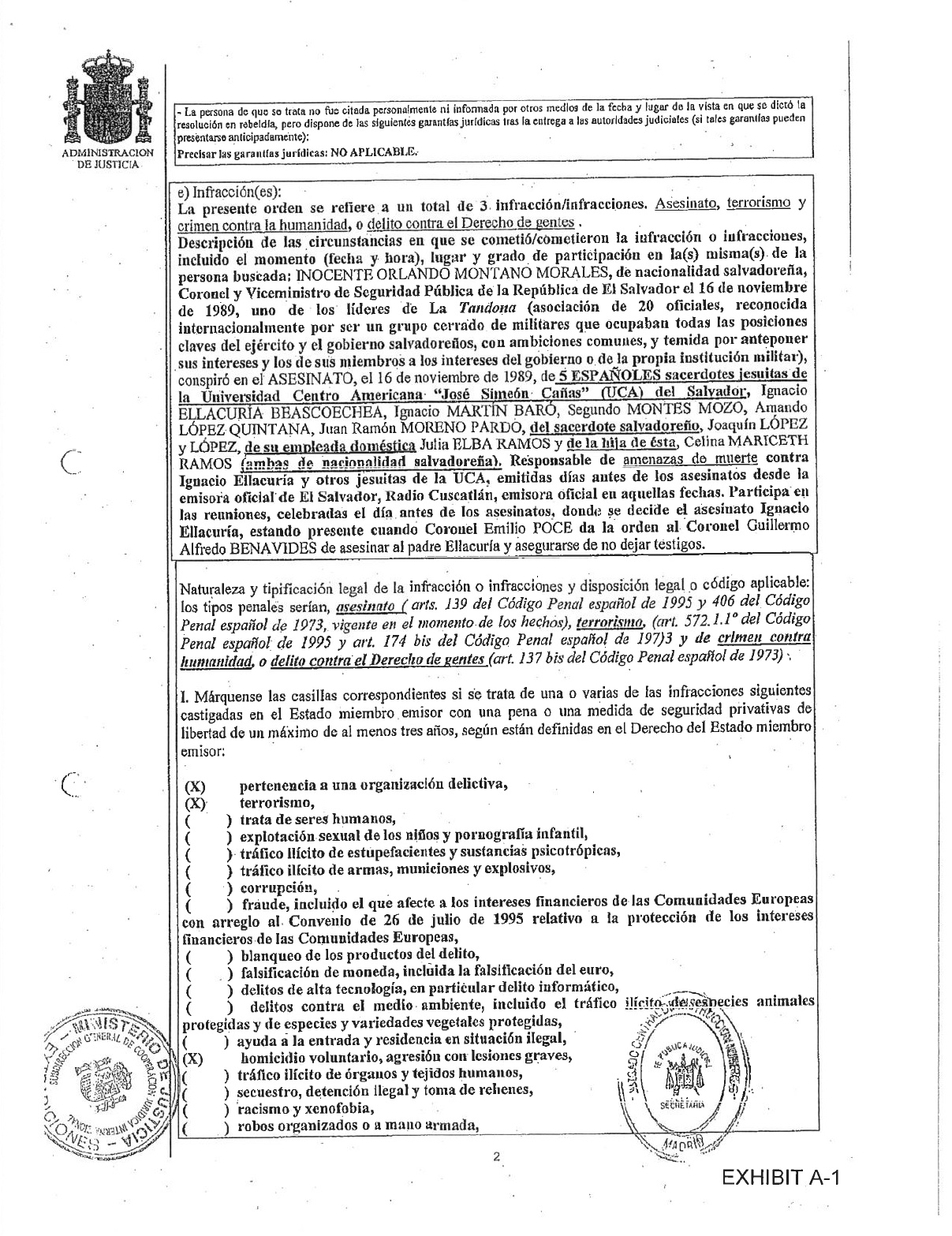 Extradition complaint seeking extradition to Spain of a former Salvadoran colonel for the murder of five Spanish Jesuit priests in El Salvador in 1989