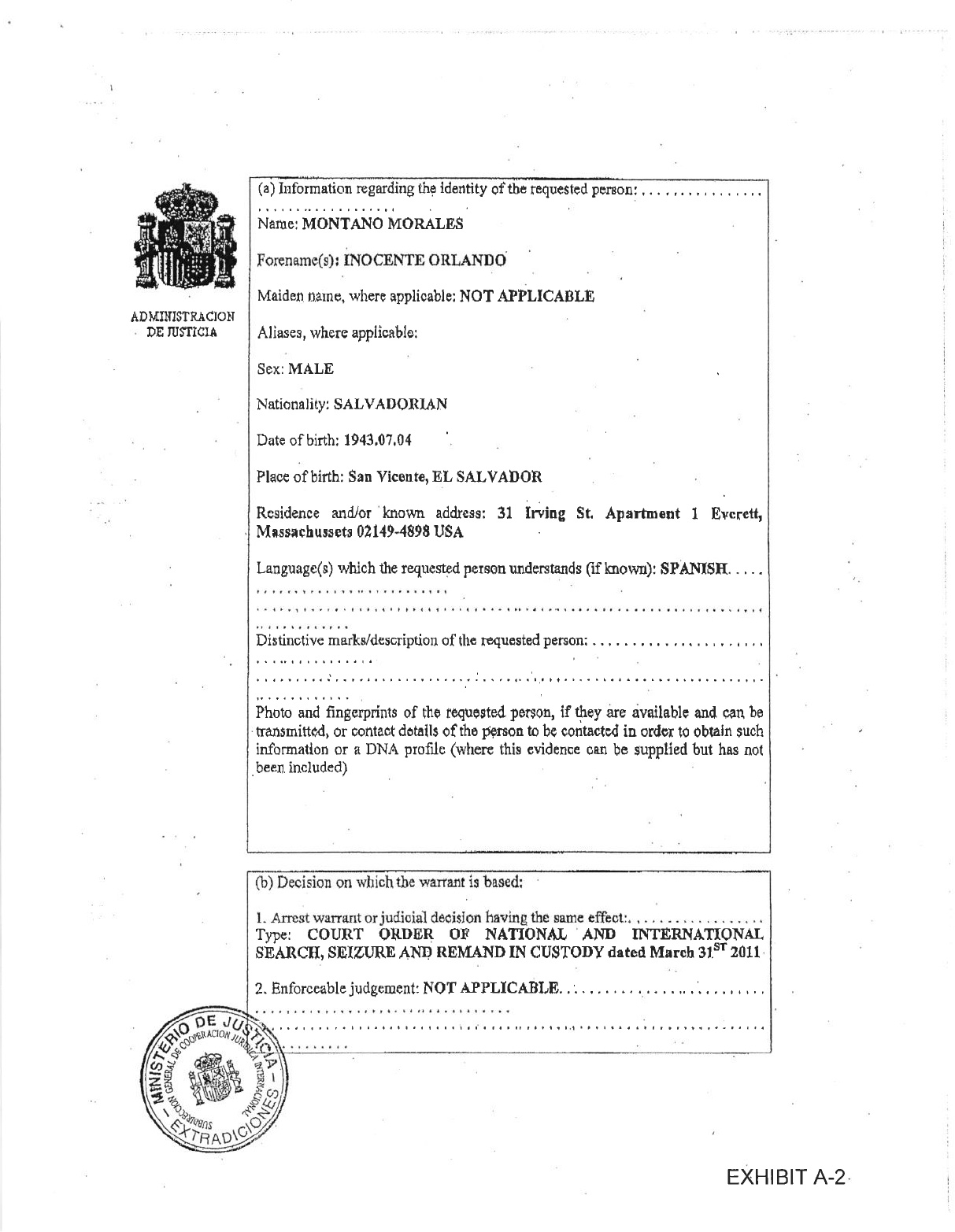 7. Request for Arrest. By Diplomatic Note No. 2/12 dated January 4, 2012, as supplemented by Diplomatic Note 59/14 dated August 21, 2014, and the Declaration of Maria Teresa Sandoval dated March 18, 2015, Spain requested the extradition of Inocente Orlando Montano Morales so that he can be prosecuted for the terrorist murders of Father Ignacio Martin Baro, Father Segundo Montes Mozo, Father Armando Lopez Quintana, Father Juan Ramon Moreno, and Father Ignacio Ellacuria Beascoechea.