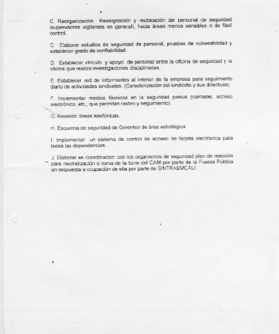 J. Elaborar en coordinación con los organismos de seguridad plan de reacción para neutralización o toma de la torre del CAM por parte de la Fuerza Pública en respuesta a ocupación de ella por parte de SINTRAEMCALI.