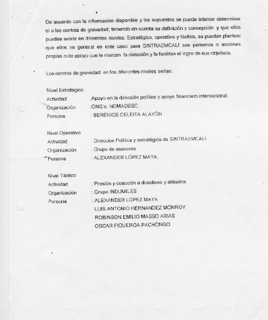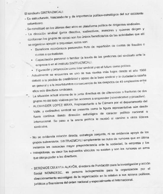 Este documento es copia del anexo al escrito que había sido remitido, el 24 de mayo de 2003, desde Santiago de Cali, por la Central de Inteligencia Militar del Ejército, Regional de Inteligencia Militar Nº 3, al Señor Coronel, Director Central de Inteligencia, en Bogotá. El Informe en cuestión fue numerado internamente bajo la referencia: 093 CIME-RIME3-INT4-252 y fue encontrado por Fiscalía y el Cuerpo Técnico de Investigaciones CTI, en dos allanamientos, en las ciudades de Cali y Medellín, el 25 de agosto de 2004. La intervención se produjo a causa de la denuncia presentada por el Representante Alexánder López Maya; este documento se encuentra en los archivos del Equipo Nizkor. [Para más información ver el documento Descubierta la "Operación Dragón" para asesinar congresistas, defensores de Derechos Humanos y líderes sindicales.]
