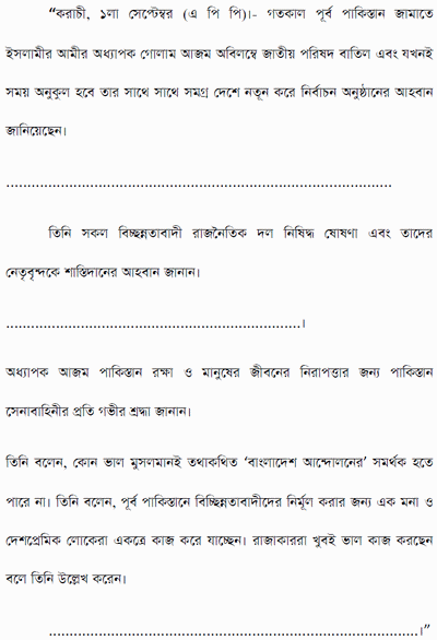 Accused Prof. Ghulam Azam as chief of the East Pakistan Jamat-e-Islami made a joint statement urging upon the patrotic people of Pakistan to destroy the Indian intruders on sight. The above report was published in the "Dainik Azad" on 08.04.1971.