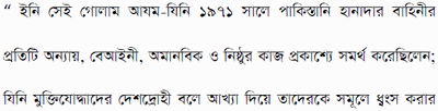 15. At the time of the War of Liberation in 1971 under the leadership of the accused, all the subordinate leaders and workers of Jammat-e-Islami and its student wing Islami Chhatra Sangha actively opposed the Liberation movement. At that time Jamaat-e-Islami itself acted as an auxiliary force under the Pakistan Armed forces. The accused as the 'Ameer' of East Pakistan Jamaat-e-Islami, not only controlled the organizational frame work of Jamaat-e-Islami and Islami Chhatra Sangha but also played the pivotal role in forming santi Committee, Razakars, Al-Badr, Al-shams, etc., to collaborate Pakistani occupation forces while Bangalee people were fighting for liberation, at that time the accused participated in a sham election and was elected uncontested as a Member of National Assembly from District Tangail in 1971. While he realized that Bangladesh was going to be liberated soon, then he left for Pakistan on 22nd November, 1971. After Liberation of Bangladesh on 16 December 1971, he formed a Committee named "Purbo Pakistan Punoruddhar Committee" (East Pakistan Restoration Committee) as a part of his campaign in the 1st part of 1972. As a leader of the committee upto March 1973, he tried to create public opinion against Bangladesh in the Islamic Countries of the Middle East and campaigned internationally against recognising Bangladesh as an independent and Sovereign state. He left Pakistan for London in the middle of 1973 and set up the head office of the "Purbo Pakistan Punoruddhar Committee" there. He also published a weekly newspaper named "Sonar Bangla" in London which propagated against independent Bangladesh. His Citizenship was cancelled by the Bangnaldesh Government on 18 April, 1973. He visited Saudi Arabia in March, 1975 and met king Foisal where he also canvassed against Bangladesh. He told the king that Hindus had captured East Pakistan, Holy Qurans had been burnt, mosques had been destroyed and converted into Mandirs (prayer place) and many Muslims had been killed. On the basis of such propaganda, he collected funds from Middle East in the name of re-establishing mosques and Madrassas. Following the assassination of the Father of the Nation Bangabandhu Sheikh Mujibur Rahman, he came back to Bangladesh on 11 August, 1978 with a Pakistani passport and since then he has been residing in this country. He got back his citizenship through court and resumed the office of 'Ameer' of Jamaat-e-Islami and he continued till Motiur Rahman Nizami was elected Ameer of Jamaat-e-Islami.
