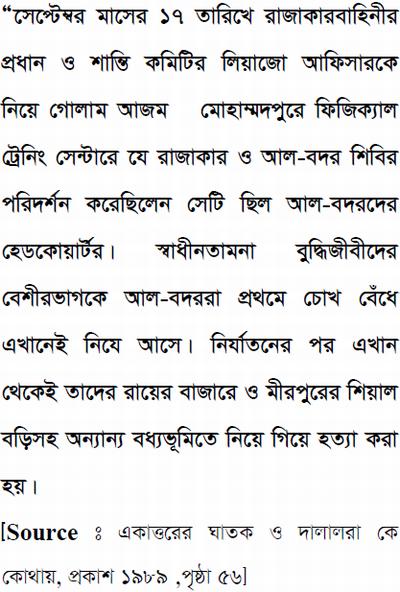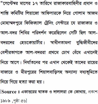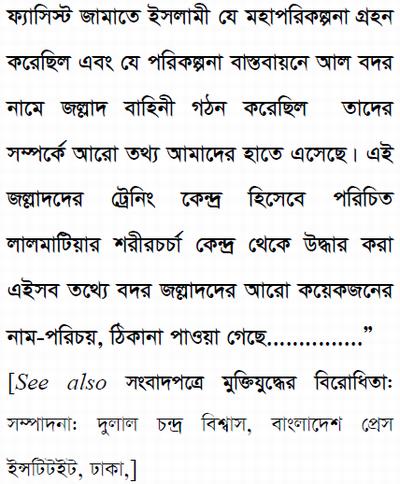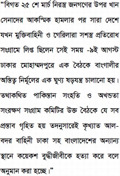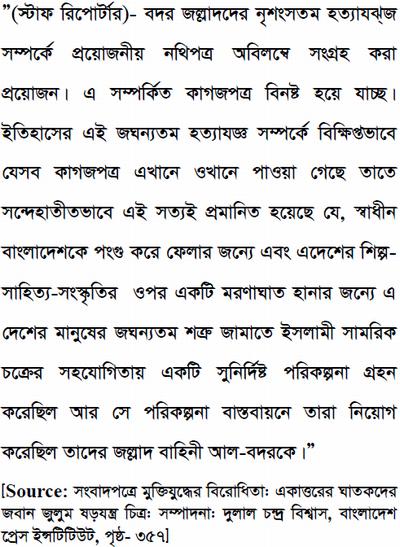 "The Al-Badhr organization, a fanatical religious group which operated as a paramilitary arm to the Pakistan Army in 1971, was responsible for some of the worst killings during the war, particularly of nationalist intellectuals." [Source: Bangladesh: The Unfinished Revolution, Published in 1979, London, page 126]