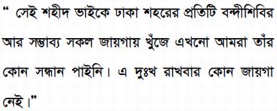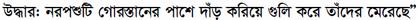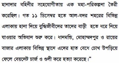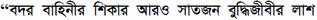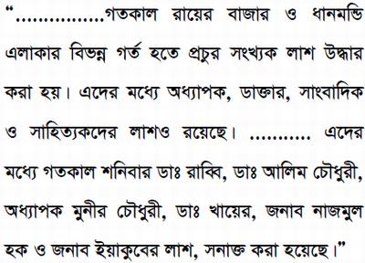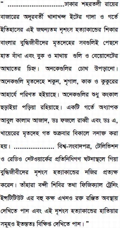 440. After 16 December 1971, the final victory, the nation started perceptive of the tragic and horrific killing of intellectuals and hundreds of civilians through the reports published in domestic and international news media and thus the relatives could recover dead bodies of their dear ones from brick fields and mass grave at the city's outskirt. A report titled published in the Daily Ittefaque 19 December 1971 narrates horrific picture that