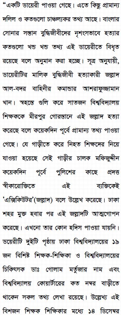 412. Fox Butterfield in his above report has made it clear that accused Chowdhury Mueen Uddin masterminded the tragic episode of 'intellectuals killing' and presumably the diary so found belonged to Chowdhury Mueen Uddin's fellow Ashrafuzzaman Khan.