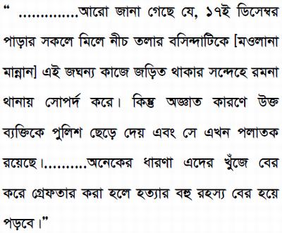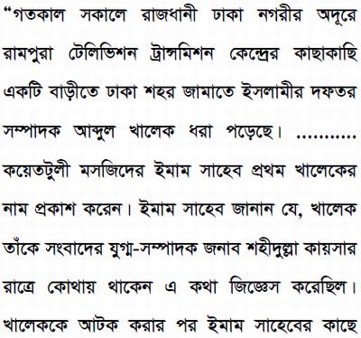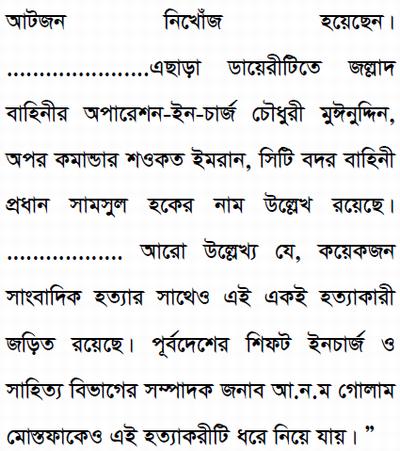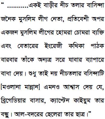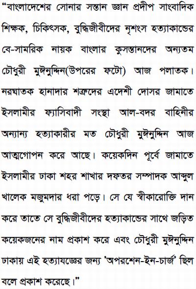 "To his fellow reporters on the Bengali language paper where he worked, Chowdhury Mueenuddin [Mueen Uddin] was a pleasant, well- mannered and intelligent young man. He had an open handsome face, with a neatly trimmed beard, and there was nothing exceptional about him except perhaps that he often received telephone calls from the leader of a right-wing Moslem political party.