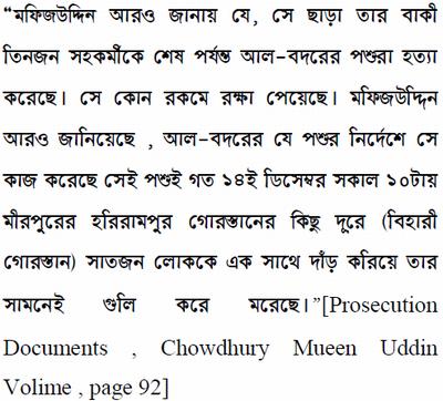 409. According to the commentary of the documentary film titled 'war crimes file' made by UK based electronic media channel-4 Chwodhury Mueen Uddin was a leading commander of AB and one of those responsible for organized and systematic slaughter of Dhaka's intelligentsias. Mr. Enaet Ullah Khan a notable journalist on being interviewed also told that "Chowdhury Mueen Uddin is not a symbol of killing, he is in fact the mastermind of the killings."