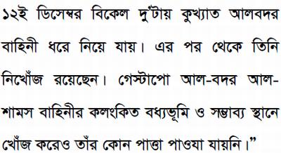 408. Naturally it was not possible to identify all the members of the group or the killing squad who had captured the victims from their residence, although the inmates had occasion to see the event of abduction of their near ones. The relatives of the victims testified that the group of attackers came to pick the victims up having their faces masked, in most cases. Even the relatives of abducted victims could not know what happened to their dear and near ones, on their capture. They came aware of the fate of the abducted victims only after 16 December 1971 when the domestic and international news media started publishing reports on the tragic events of 'killing of intellectuals', on abduction between 10 December and 15 December 1971. Only hours before the official surrender was signed (on 16th), the victims were taken in groups to the outskirts of the city......where they were summarily executed.[The Times, December 23, 1971] . By going through these reports and photo of the accused persons published therewith the relatives of some of victims could recognise the offenders who committed the criminal act of abduction by keeping their faces uncovered.