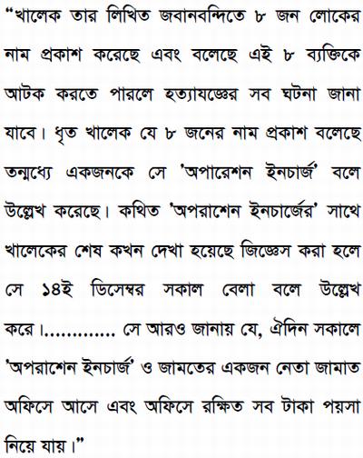 published in The Daily 'Dainik Pakistan', 29 December 1971 demonstrates culpable role of JEI as well in designing and executing the plan of liquidating intellectuals. The report narrates that