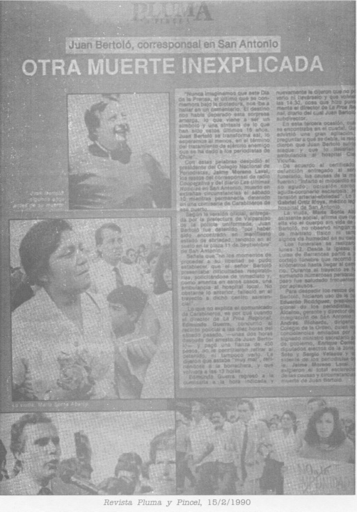 "En extrañas circunstancias dejó de existir el periodista Juan Bertoló, luego de ser detenido en la Comisaría de San Antonio, de 47 años, casado, el profesional cumplía, labores en el diario Las Ultimas Noticias, radío Cooperativa y el diario regional Proa", señalaron las informaciones de prensa publicadas en ese tiempo.