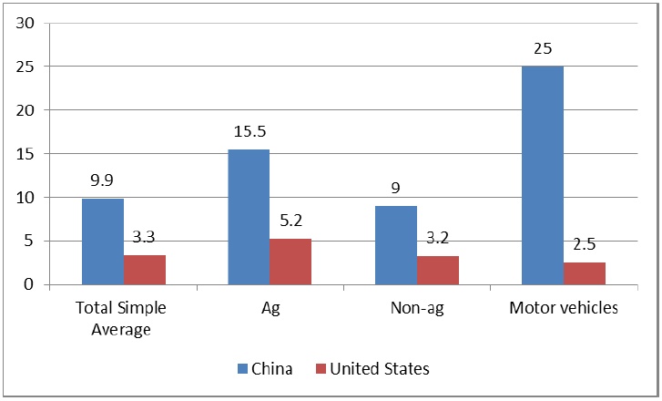 178. Another way to compare tariff burdens is to calculate the trade weighted average tariff, which is the sum of duties collected over the sum of import values. China's average tariff under this measurement is 4.5% (down from 14.1% in 2001) while the U.S. level is 2.4%. For agricultural and non-agricultural products, China's trade weighted tariffs were 9.7% and 4%, respectively, indicating that China's effective tariffs on agricultural products is much higher than industry goods. To illustrate, the highest tariff Chinese imposes is 65%, and is applied on wheat, rice, and wine. [Back]