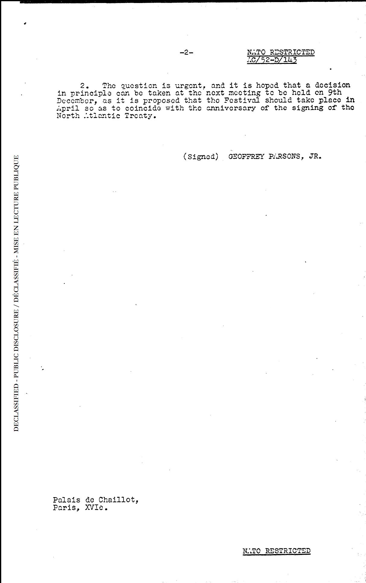 2. The question is urgent, and it is hoped that a decision in principle can be taken at the next meeting to be held on 9th December, as it is proposed that the Festival should take place in April so as to coincide with the anniversary of the signing of the North Atlantic Treaty.