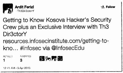 16. On or about July 10, 2015, @Th3Dir3ctorY posted a tweet identifying himself as "Owner of Kosova Hacker's Security, Pentagon Crew," and again used the name Ardit Ferizi: