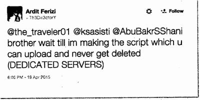33. The April 26-27, 2015 communication in which FERIZI sent PII to Hamayun was not the first in which FERIZI communicated with ISIL members/supporters and offered them his computer expertise. On April 19, 2015, using @Th3Dir3ctorY, FERIZI posted a publicly available tweet directed to ISIL-affiliated accounts, which read: "@the_traveler01 @ksasisti @AbuBakrSShani brother wait till im [sic] making the script which u can upload and never get deleted (DEDICATED SERVERS)" [.]