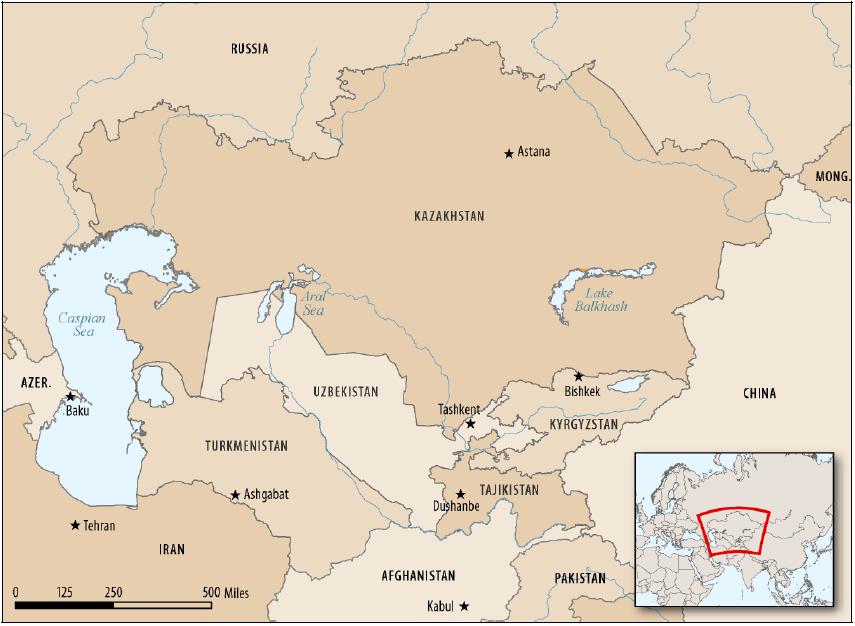 Figure 1. Central Asia: Kazakhstan, Kyrgyzstan, Tajikistan, Turkmenistan, and Uzbekistan