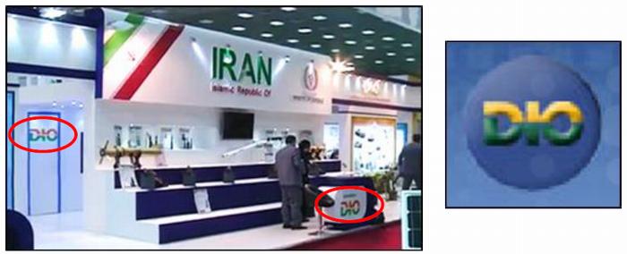 Stand iranien au cinquième salon iraquien de défense (photo de gauche) et logo de la Defense Industries Organisation (photo de droite)Source : Images extraites d'une vidéo diffusée par l'agence de presse de la Radio-Télévision de la République islamique d'Iran (photo de gauche) et du site Web de la Defense Industries Organisation (http://www.diomil.ir/en/home.aspx), consultable au moyen de la Wayback Machine Internet archive (http://archive.org/web.php) (photo de droite).