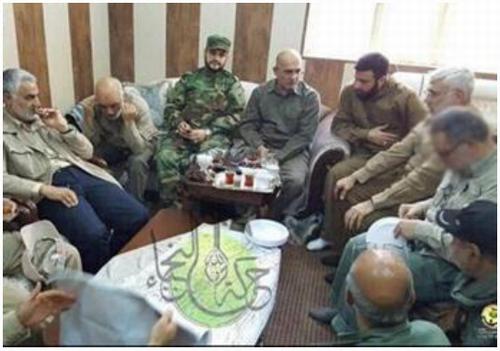 Le général Soleimani dans ce qui a été qualifié de « centre d'opérations de Fallouja »Source : Agence de presse Fars, photo publiée le 25 mai 2016 accompagnée d'une légende (en anglais) indiquant que la branche média du mouvement iraquien Harakat Hezbollah al-Nujaba a publié des photos d'un centre d'opérations des forces populaires sur lesquelles on peut voir le général Qasem Soleimani, Commandant de la Force Al-Qods, en grande discussion avec le chef de l'organisation Badr, Hadi Al-Amiri, le chef du mouvement Harakat Hezbollah al-Nujaba, Akram Al-Ka'abi, et un autre commandant des forces populaires, Abu Mahdi Al-Muhandis (sur la photo, le général Soleimani se trouve à l'extrême gauche).