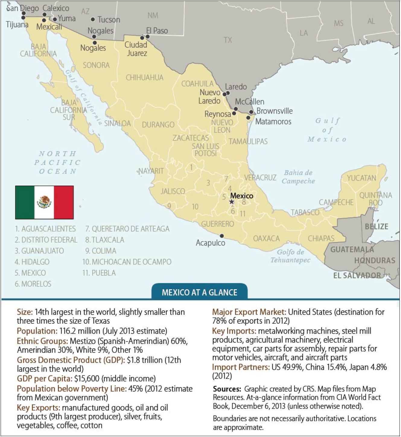 CRS Report R41349, U.S.-Mexican Security Cooperation: The Merida Initiative and Beyond, by Clare Ribando Seelke and Kristin Finklea. CRS Report R43001, Supporting Criminal Justice System Reform in Mexico: The U.S. Role, by Clare Ribando Seelke. CRS Report RL32934, U.S.-Mexico Economic Relations: Trends, Issues, and Implications, by M. Angeles Villarreal. CRS Report R43313, Mexico's Oil and Gas Sector: Background, Reform Efforts, and Implications for the United States, coordinated by Clare Ribando Seelke. CRS Report R43312, U.S.-Mexico Water Sharing: Background and Recent Developments, by Nicole T. Carter, Clare Ribando Seelke, and Daniel T. Shedd. CRS Report R43320, Immigration Legislation and Issues in the 113th Congress, coordinated by Andorra Bruno. CRS Report R43798, The Obama Administration's November 2014 Immigration Initiatives: Questions and Answers, by Kate M. Manuel.