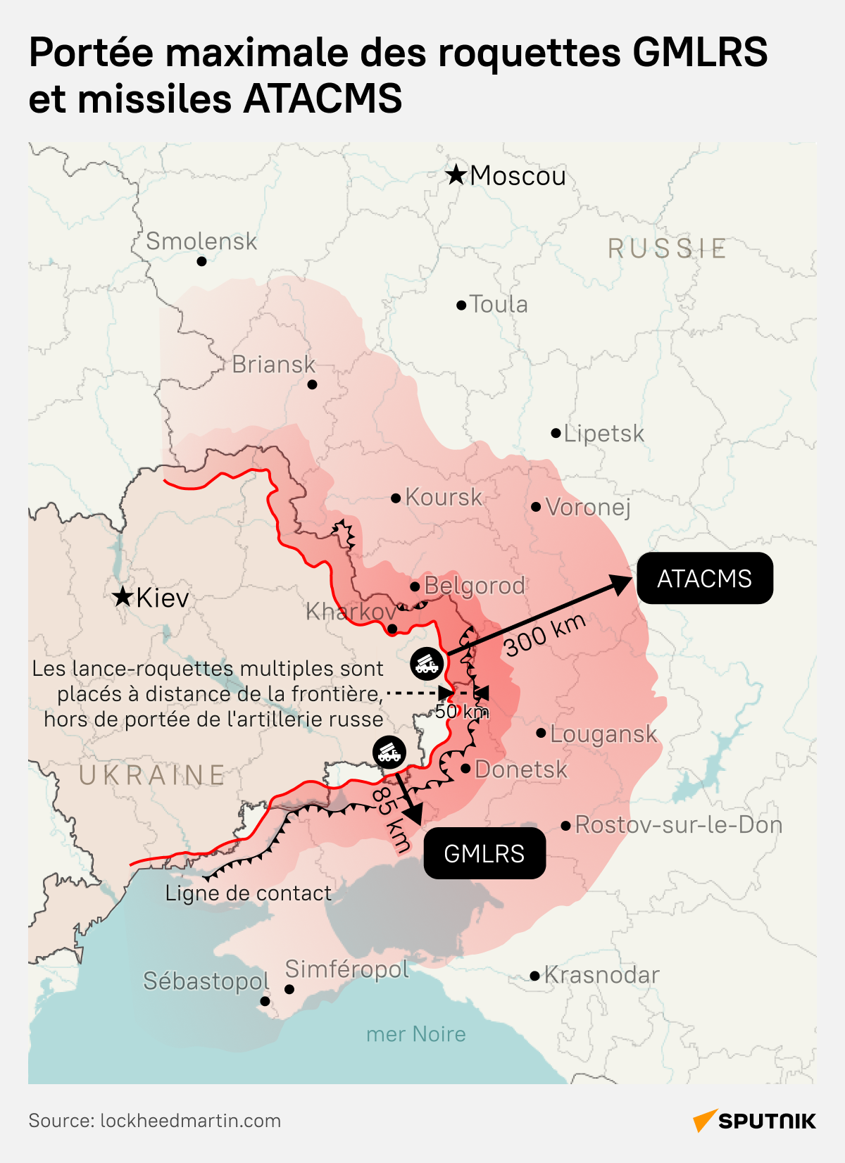 Portée maximale des roquettes GMLRS et missiles ATACMS Infographie de Sputnik, Moscou, 20nov24 [FRA]