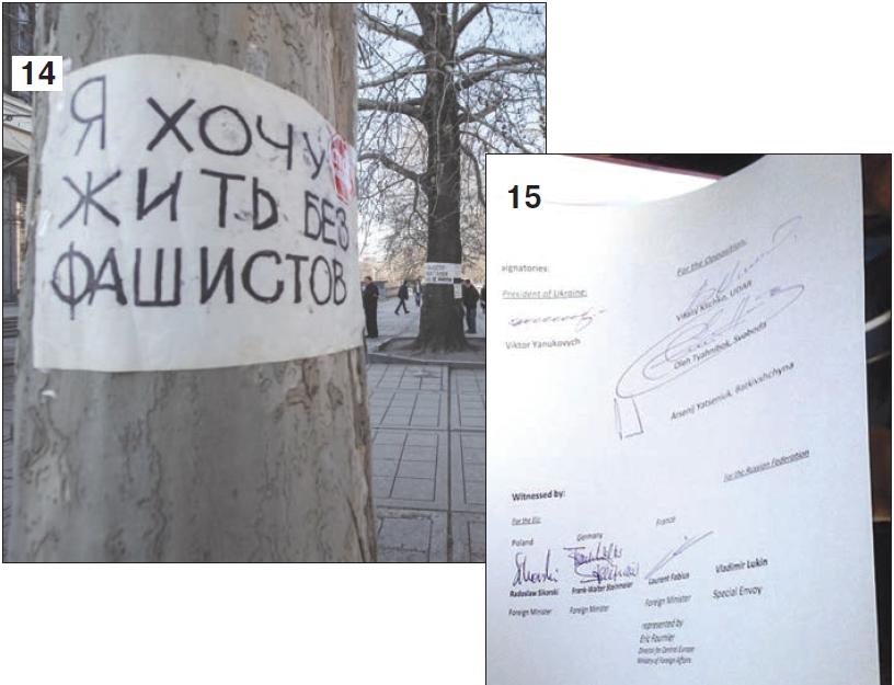 1. On November 21, 2013 in Kiev, protests under the «Euromaidan» title began. They were organized by a number of opposition parties that disagreed with the decision of the Government of Ukraine to suspend the signing of the Association Agreement with the European Union. [Back]