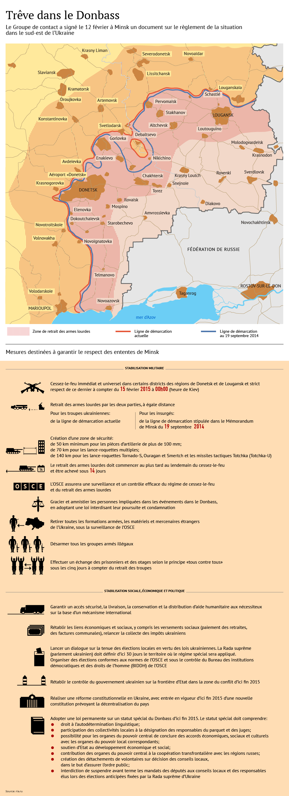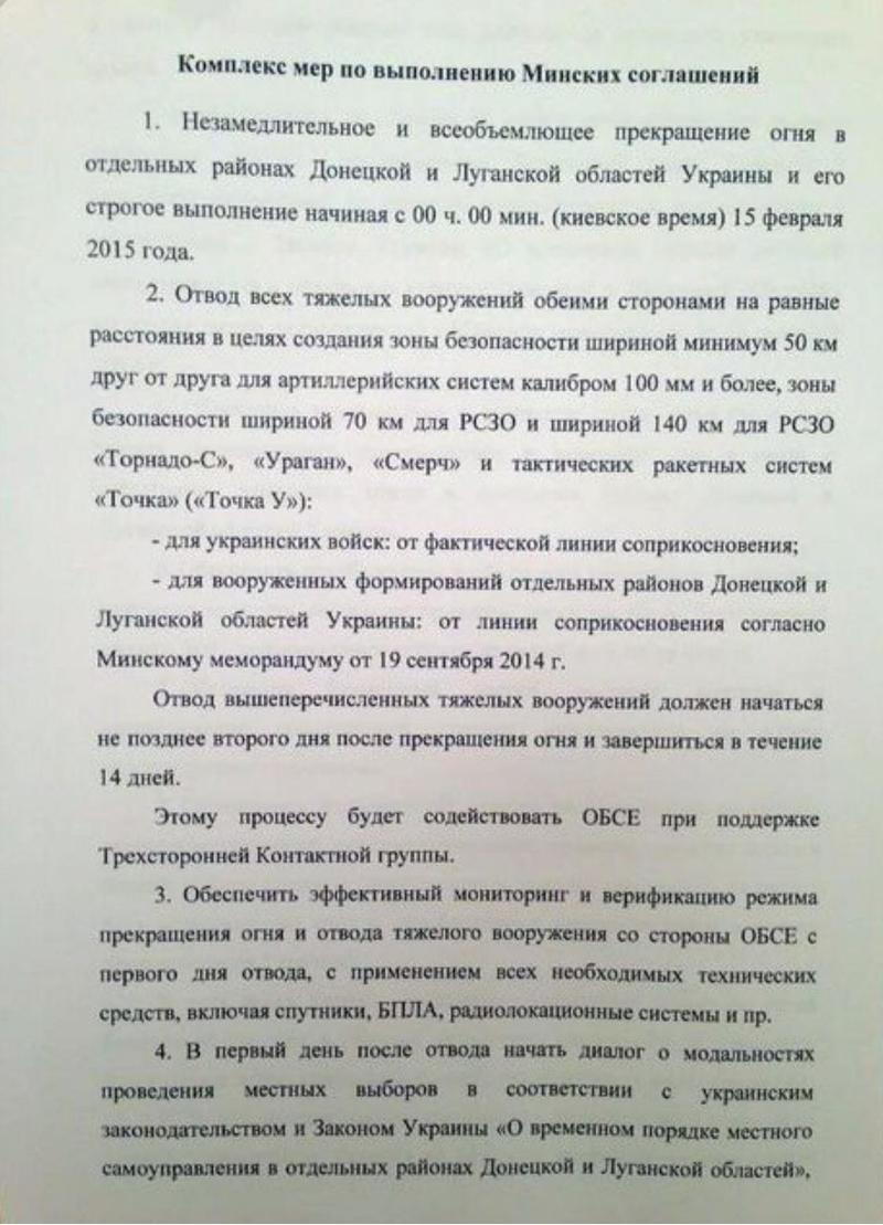 1. Незамедлительное и всеобъемлющее прекращение огня в отдельных районах Донецкой и Луганской областей Украины и его строгое выполнение начиная с 00 ч. 00 мин. (киевское время) 15 февраля 2015 года.