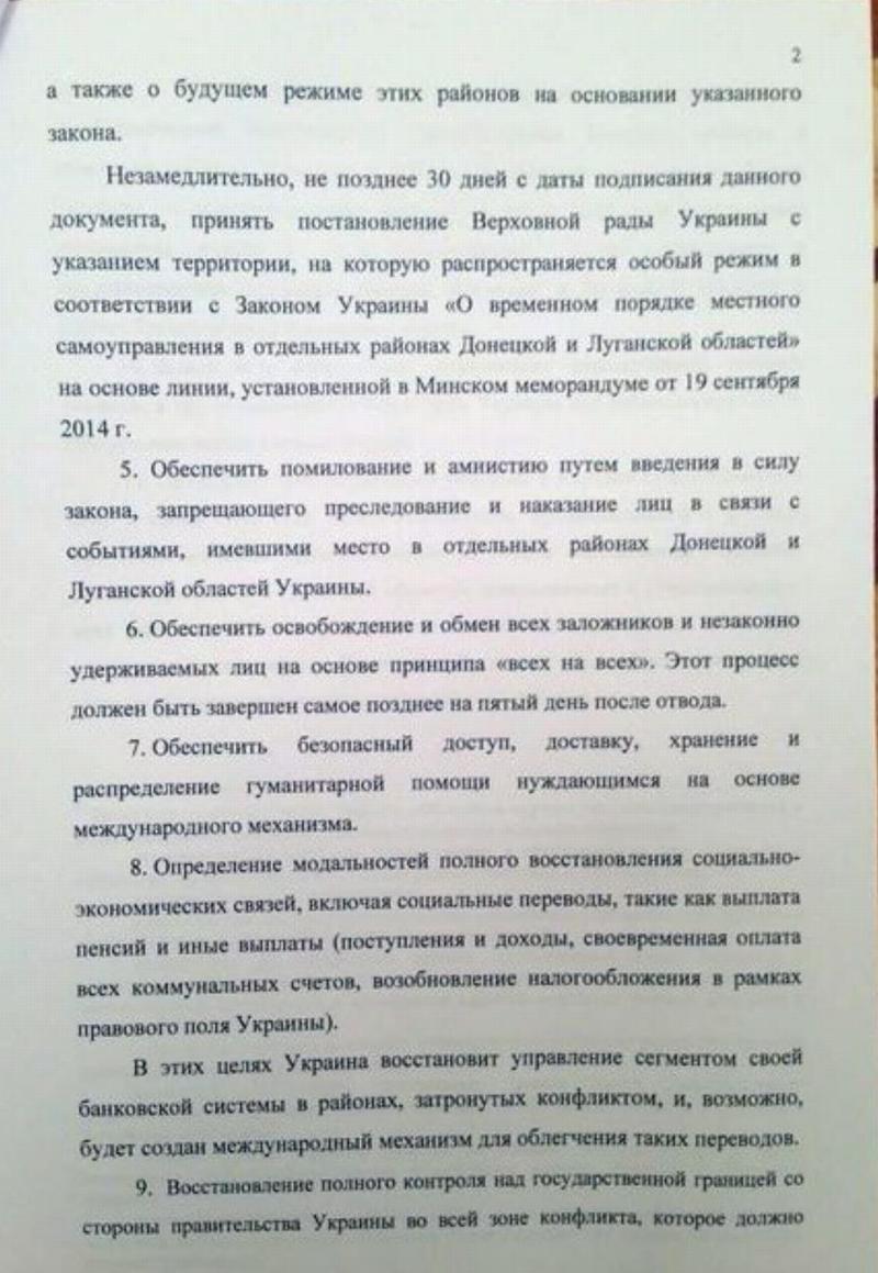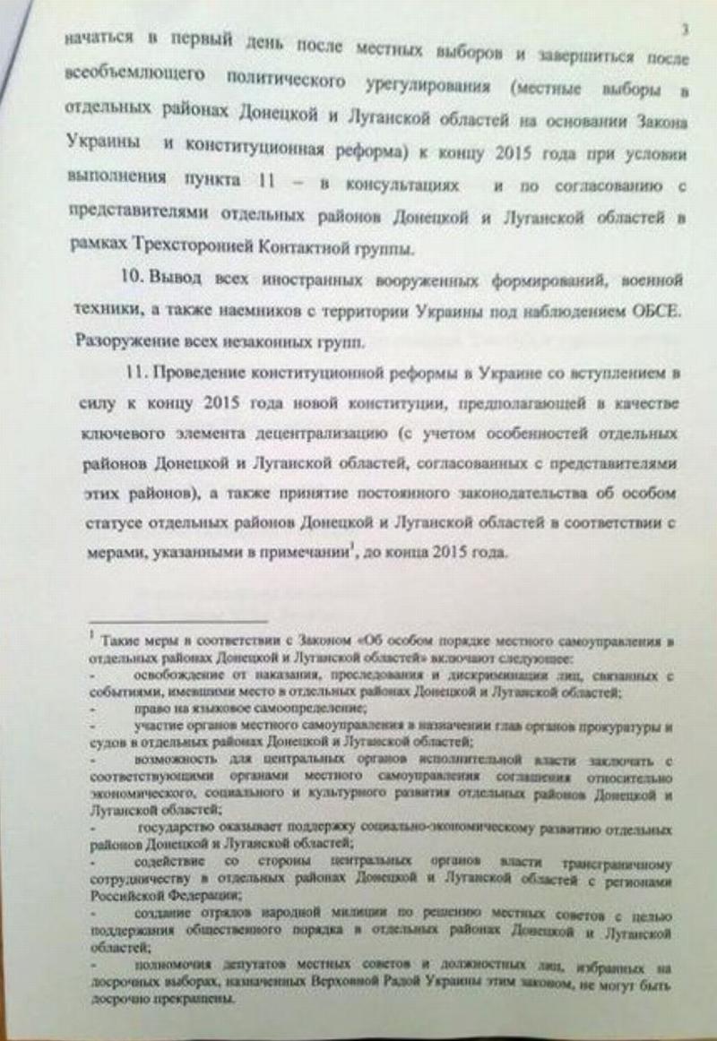 Незамедлительно, не позднее 30 дней с даты подписания данного документа, принять постановление Верховной Рады Украины с указанием территории, на которую распространяется особый режим в соответствии с Законом Украины +О временном порядке местного самоуправления в отдельных районах Донецкой и Луганской областей- на основе линии, установленной в Минском меморандуме от 19 сентября 2014 г.