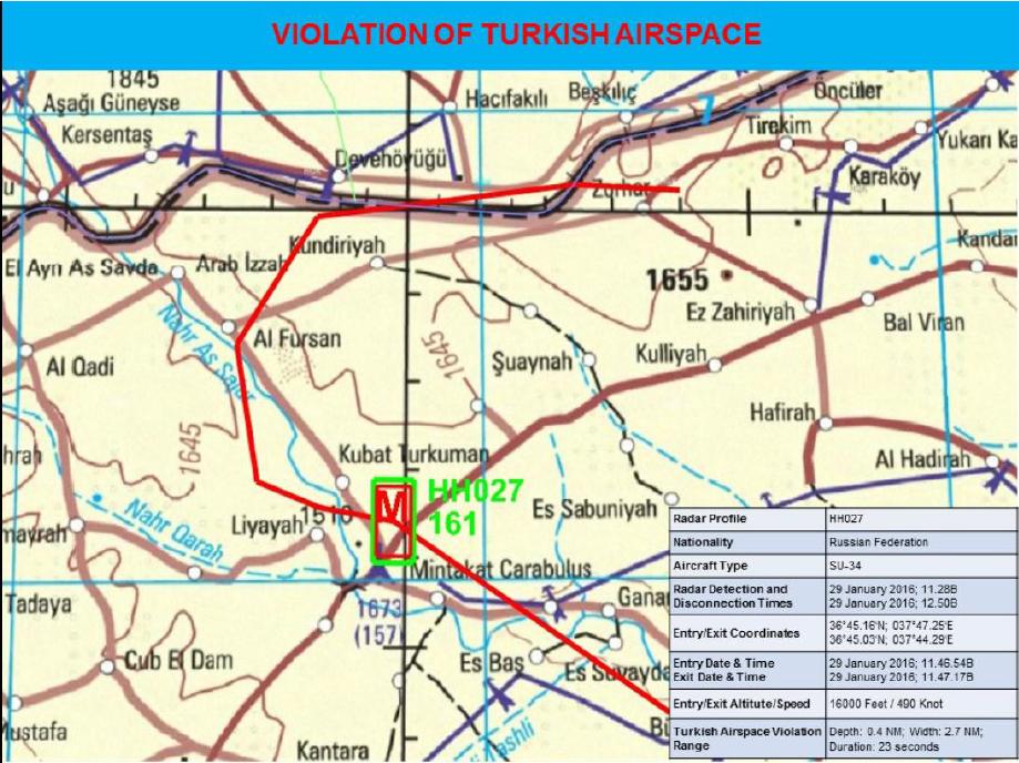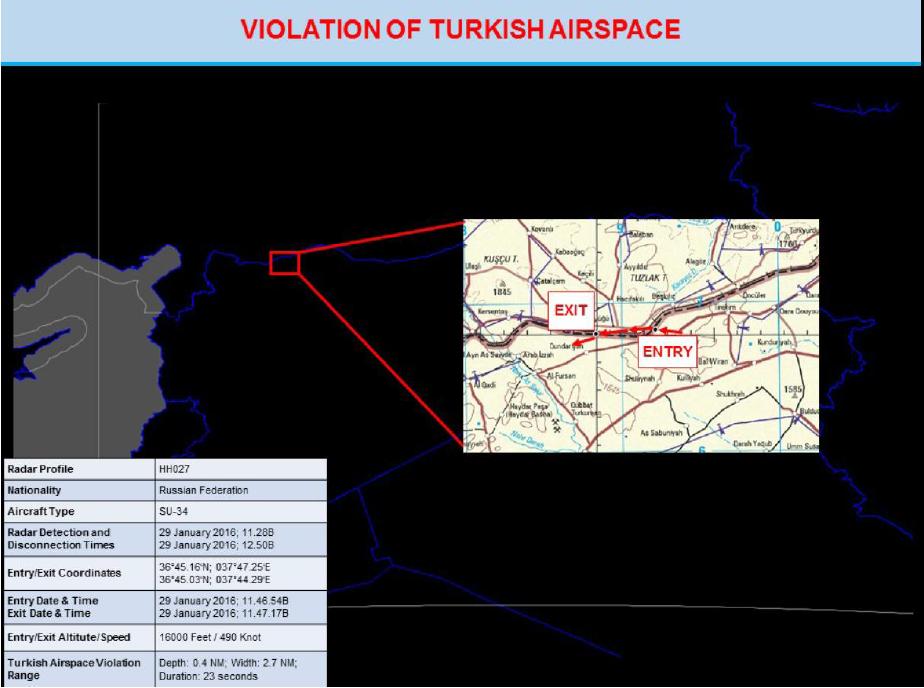 Después de las dos primeras violaciones, ocurridas el 3 y el 4 de octubre de 2015, un general de dos estrellas de las fuerzas armadas rusas visitó Ankara con una delegación para dar explicaciones. Las autoridades militares de Turquía comunicaron a la delegación de la Federación de Rusia las consecuencias que podrían tener unas violaciones tan extensas, propusieron medidas prácticas para evitar que se volvieran a producir incidentes similares y les proporcionaron los datos técnicos detallados de las violaciones. Además, tras el incidente del 24 de noviembre de 2015, las autoridades militares de Turquía comunicaron también al agregado militar ruso en Ankara los datos detallados de las violaciones del espacio aéreo que habían tenido lugar el 22 de diciembre de 2015 y el 29 de enero de 2016 y le advirtieron en repetidas ocasiones de las graves consecuencias que podrían derivarse de tales actos ilícitos.
