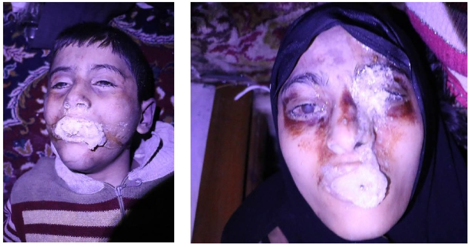 - brûlures cutanées et brûlures de la cornée.Aucune mort par effet mécanique n'est visible. L'ensemble de ces symptômes est caractéristique d'une attaque par armes chimiques, notamment par des agents suffocants et par des agents organophosphorés ou de l'acide cyanhydrique. Par ailleurs, l'utilisation supposée de bronchodilatateurs par les services médicaux observée dans les vidéos renforce l'hypothèse d'une intoxication par des agents suffocants.