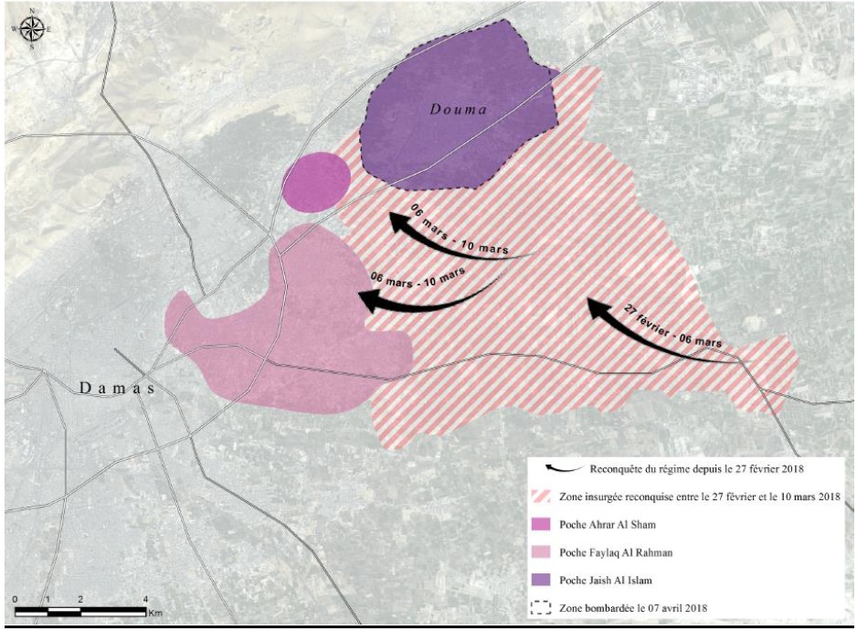 Les négociations avec Jaïsh al-Islam, entamées en mars n'ont pas été pleinement concluantes. Le 4 avril, une partie seulement des JaI (estimée à un quart du groupe) a accepté l'accord de reddition, transférant les combattants et leurs familles à destination d'Idlib (environ 4.000 personnes, avec les familles). Cependant, de 4.500 à 5.500 combattants du JaI, localisés principalement à Douma, ont refusé les termes de la négociation. Dès lors, à compter du 6 avril, le régime syrien, appuyé par les forces russes, a repris ses bombardements intensifs sur la localité, mettant fin à une pause opérationnelle, tant terrestre qu'aérienne, constatée depuis le lancement des négociations mi-mars. C'est dans ce contexte que sont intervenues les frappes chimiques analysées ici.