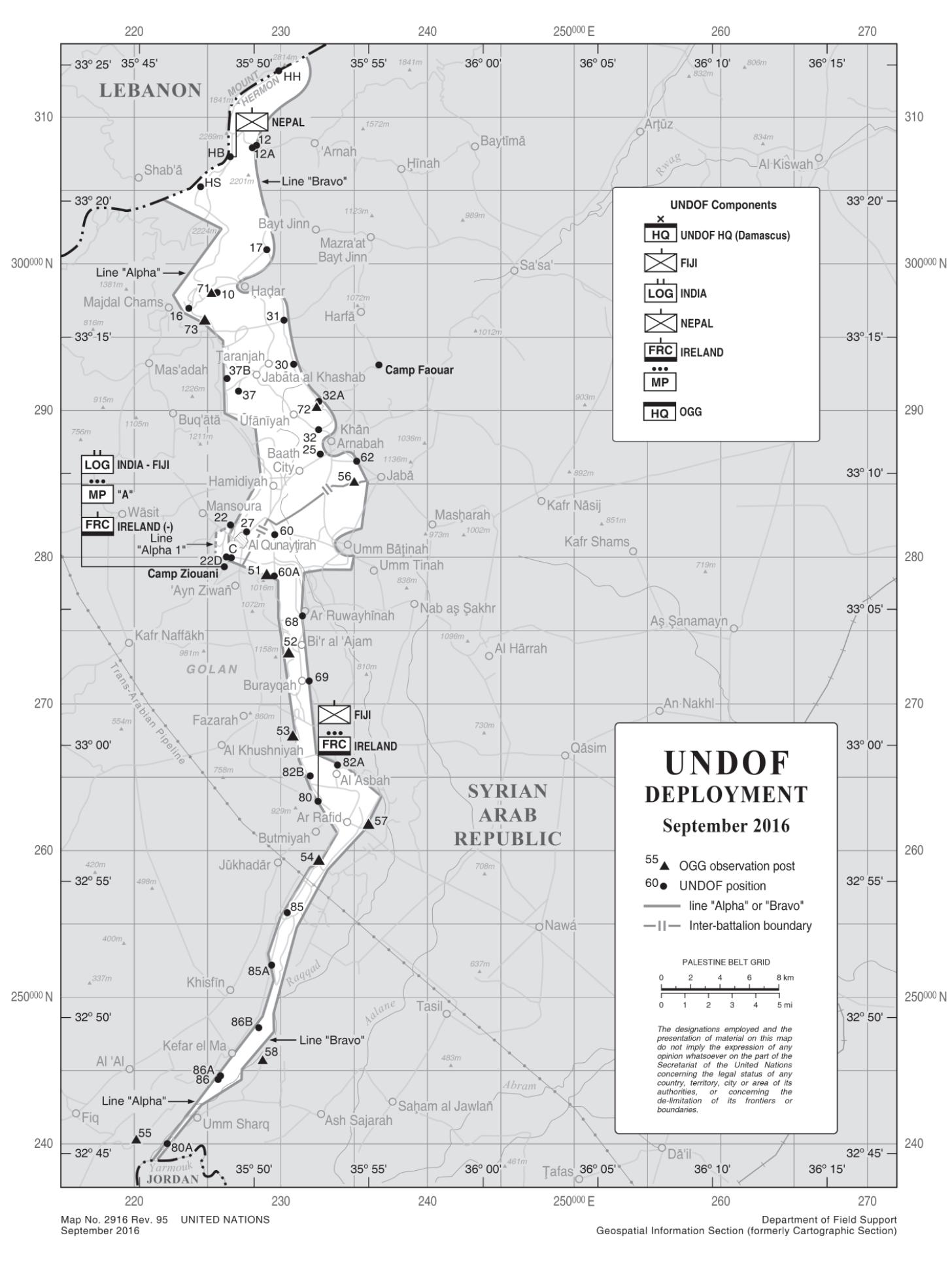 27. Al 12 de agosto de 2016, la FNUOS estaba compuesta por 865 soldados, entre ellos 21 mujeres. Actualmente, los efectivos desplegados proceden de Bhután (2), Chequia (3), Fiji (301), Finlandia (2), la India (219), Irlanda (136), Nepal (200) y los Países Bajos (2). Además, 67 observadores militares del ONUVT, incluidas 6 mujeres, ayudaron a la Fuerza en el desempeño de sus tareas.