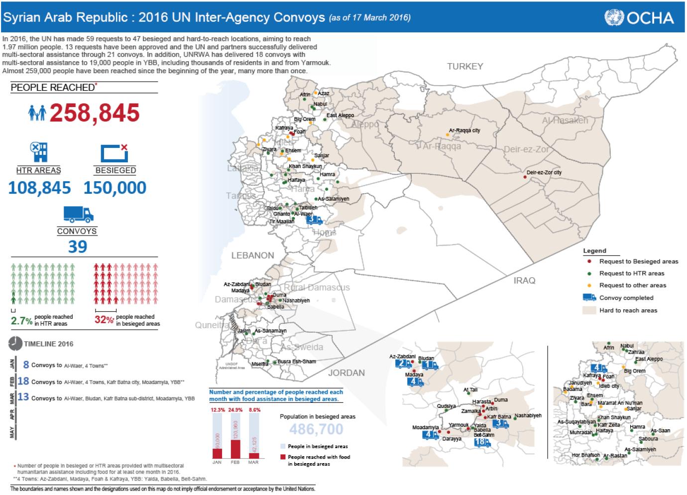 25. En febrero y principios de marzo de 2016, se despacharon convoyes interinstitucionales a los emplazamientos sitiados y de difícil acceso que se indican en el cuadro 2, con los que se dio asistencia a aproximadamente 259.000 personas necesitadas (véase también el anexo, mapa 2).