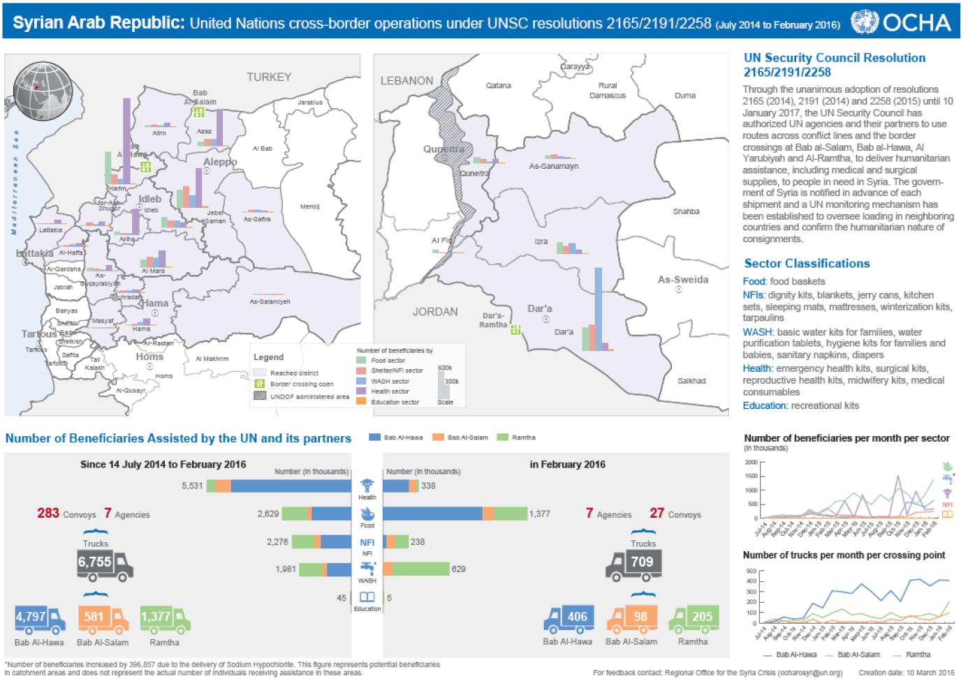 2. La información que aquí figura se basa en los datos de que disponían los organismos de las Naciones Unidas sobre el terreno, en datos facilitados por el Gobierno de la República Árabe Siria y en datos procedentes de otras fuentes sirias y de fuentes públicas. Los datos de los organismos de las Naciones Unidas sobre las entregas de suministros humanitarios corresponden al período comprendido entre el 1 y el 29 de febrero de 2016. También se han incluido datos más recientes que estaban disponibles.