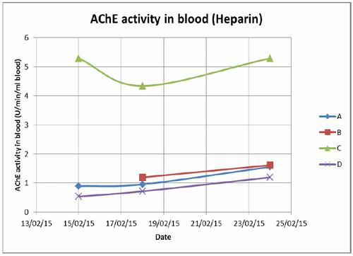 Range of normal value CI 95 % (5.17-9.15)AchE Activity compare to the Haemoglobin (U/min/fiM Hb) Range of normal value CI 95 % (0. 60-0.94) 15-Feb-15 H A 0.89 0.09 15-Feb-15 E 0.83 0.09 18-Feb-15 H 0.95 0.09 24-Feb-15 H 1.55 0.15 24-Feb-15 E 1.61 0.16 18-Feb-15 H B 1.19 0.12 24-Feb-15 H 1.61 0.18 24-Feb-15 E 1.66 0.18 15-Feb-15 H C 5.29 0.58 15-Feb-15 E 5.29 0.58 18-Feb-15 H 4.34 0.46 24-Feb-15 H 5.29 0.56 24-Feb-15 E 5.29 0.57 15-Feb-15 H D 0.53 0.06 15-Feb-15 E 0.48 0.06 18-Feb-15 H 0.71 0.09 24-Feb-15 E 1.19 0.15 24-Feb-15 H 1.19 0.15 18-Feb-15 H E 6.54 0.69 6. The time frame of changes to the level of AChE activity in the blood of the selected samples related to the Darayya incident 15 February 2015: