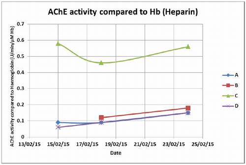 7. The time frame of changes to the level of AChE activity compared to haemoglobin for the selected samples related to the Darayya incident 15 February 2015: