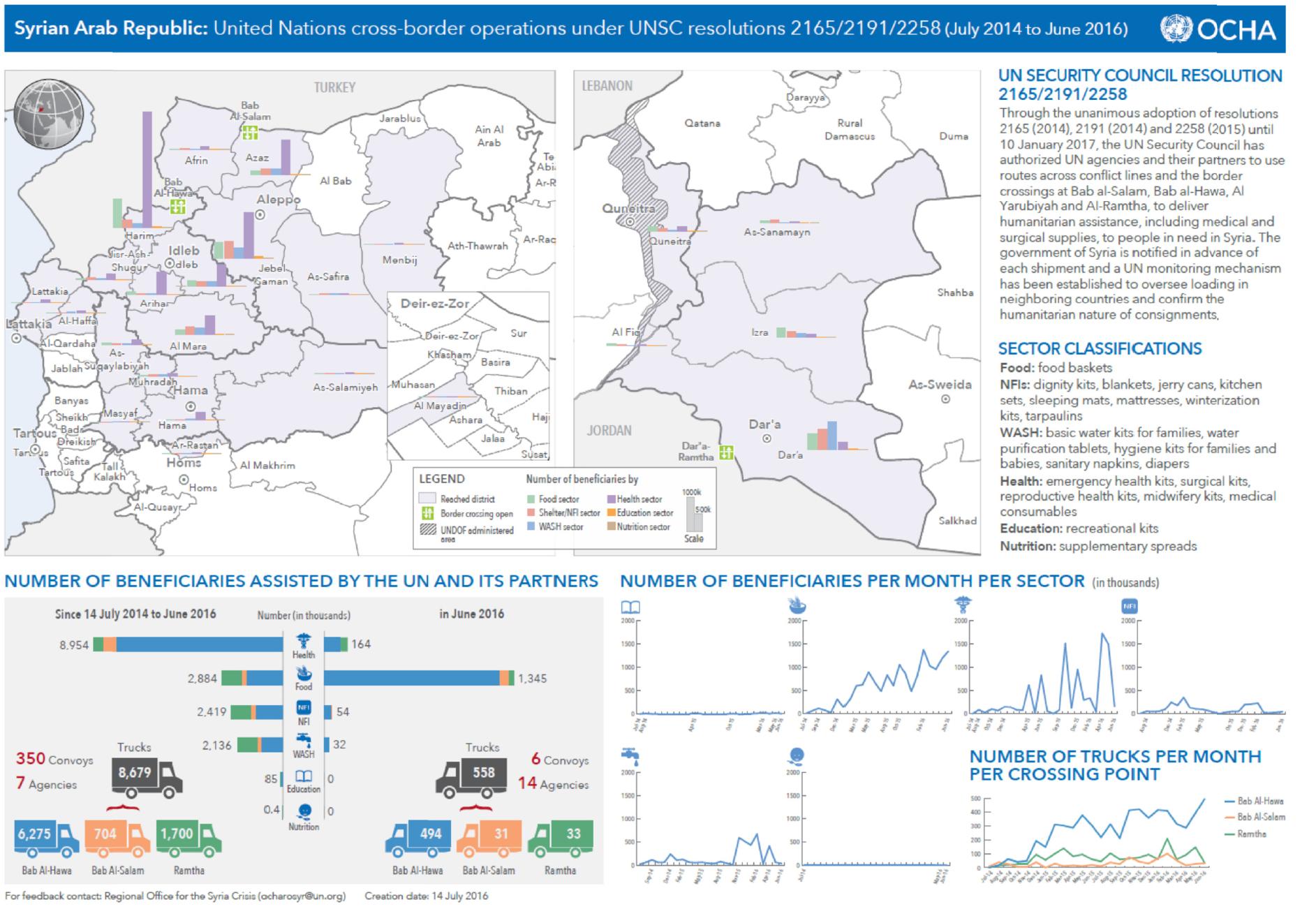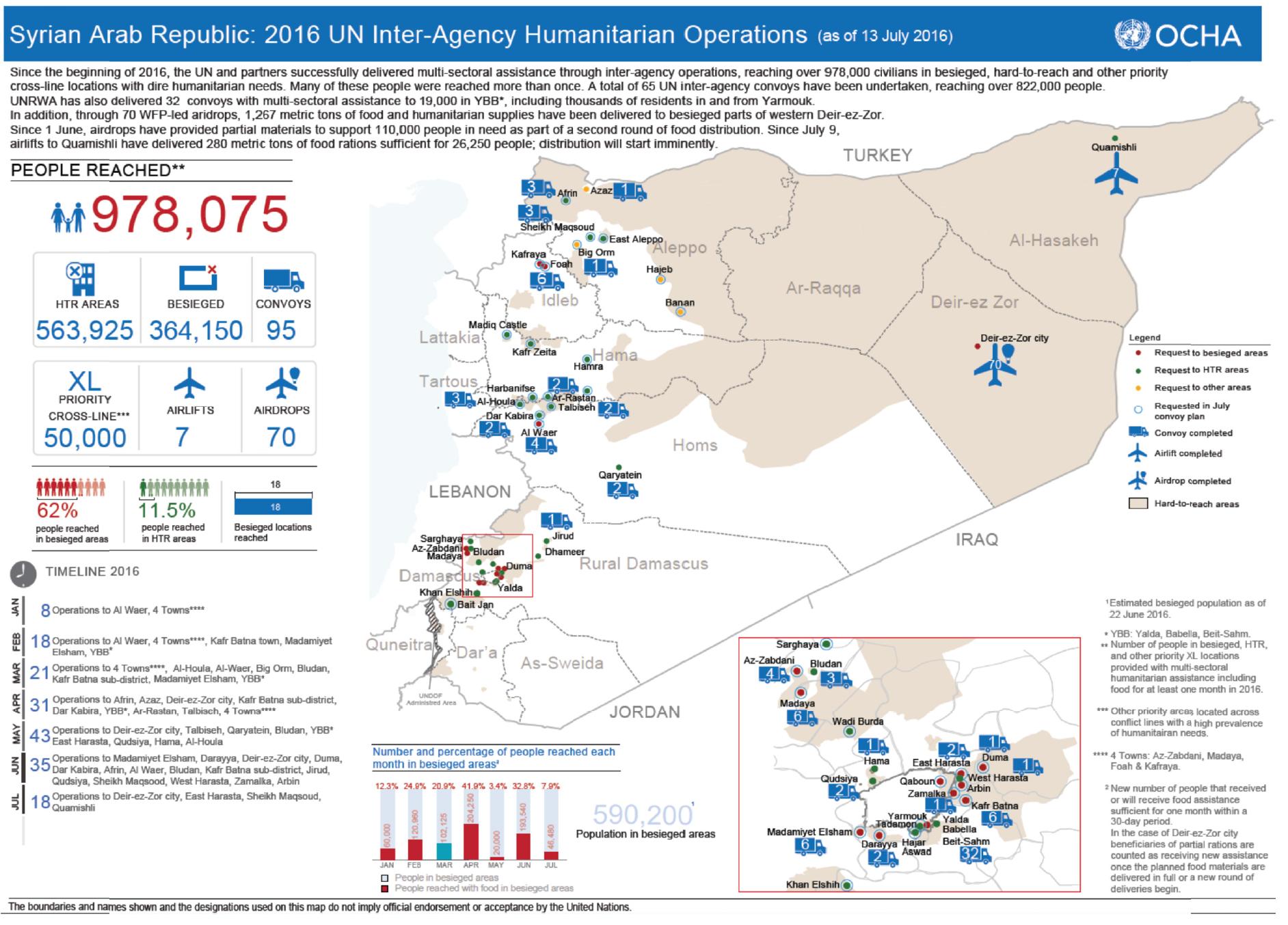 2. La información que aquí figura se basa en los datos a disposición de los organismos de las Naciones Unidas sobre el terreno, así como en datos del Gobierno de la República Árabe Siria, otras fuentes sirias y fuentes públicas. La información de los organismos de las Naciones Unidas sobre sus entregas de suministros humanitarios corresponde al período comprendido entre el 1 y el 30 de junio de 2016. También se han incluido los datos más recientes que estaban disponibles.