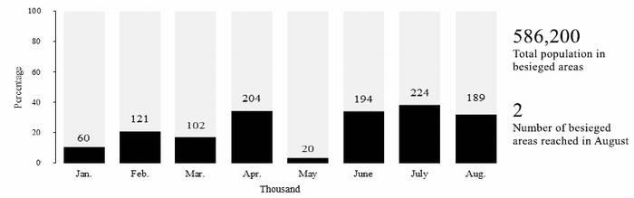 United Nations inter-agency cross-line operations: number of people reached each month in besieged areas23. Active conflict in several governorates hindered the effective delivery of humanitarian assistance, as well as people's access to essential services. Markets, schools, medical and other civilian infrastructures were damaged as a result of fighting in August, reducing the availability of basic and essential services in critical areas. For example, on 2 August, an air strike reportedly hit the Usama bin Zayd school in Aleppo, causing destruction on the upper floors of the building as well as some minor damage to the ground floor. The United Nations Relief and Works Agency for Palestine Refugees in the Near East (UNRWA) was not able to access Yalda again in August because of ongoing security concerns. The previous UNRWA mission to that area was on 25 May 2016.