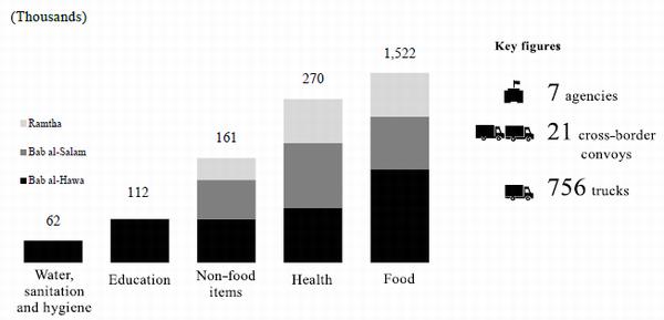Organization Number of people reached Food and Agriculture Organization of the United Nations - International Organization for Migration 45 373 Office of the United Nations High Commissioner for Refugees 242 662 United Nations Children's Fund 2 000 000 United Nations Development Programme 1 200 000 United Nations Population Fund 384 507 United Nations Relief and Works Agency for Palestine Refugees in the Near East 450 000 World Food Programme 4 190 000 World Health Organization 595 150 32. During the reporting period, cross-border deliveries continued from Turkey and Jordan into the Syrian Arab Republic under the terms of resolutions 2165 (2014), 2191 (2014) and 2258 (2015) (see figure III for details). In line with the Security Council resolutions, the United Nations notified the Syrian authorities in advance of each shipment, including content, destination and number of beneficiaries. The United Nations Monitoring Mechanism for the Syrian Arab Republic continued its operations, monitoring 756 trucks used to deliver 21 consignments in August, confirming the humanitarian nature of each, and notifying the Syrian authorities after each shipment. The Mechanism continued to benefit from excellent cooperation with the Governments of Jordan and Turkey.
