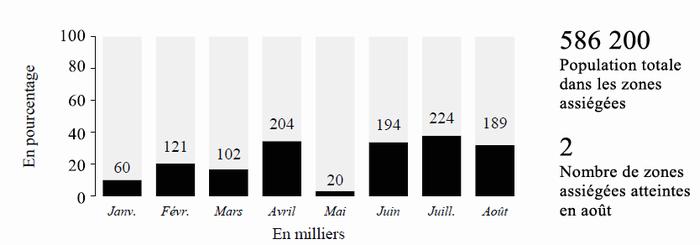 Opérations interinstitutions des Nations Unies dans les zones situées au-delà des lignes de front : nombre de personnes ayant bénéficié d'une assistance dans les zones assiégées, par mois23. Les combats qui se poursuivent dans plusieurs provinces ont également nui au bon acheminement de l'aide humanitaire et empêché les populations d'avoir accès aux services essentiels. Des marchés, des écoles, des établissements médicaux et d'autres infrastructures civiles ont été endommagées en raison des affrontements en août, ce qui a réduit les services de base et services essentiels disponibles dans les zones critiques. Par exemple, le 2 août, une frappe aérienne aurait touché l'école Ousama Bin Zaid à Alep, entraînant la destruction des étages supérieurs de l'immeuble ainsi que des dégâts mineurs au rez-de-chaussée. L'Office de secours et de travaux des Nations Unies pour les réfugiés de Palestine dans le Proche -Orient (UNRWA) n'a pas pu de nouveau se rendre à Yalda en août, à cause de la situation préoccupante qui continuait de régner en matière de sécurité. La mission précédente de l'UNRWA remonte au 25 mai 2016.