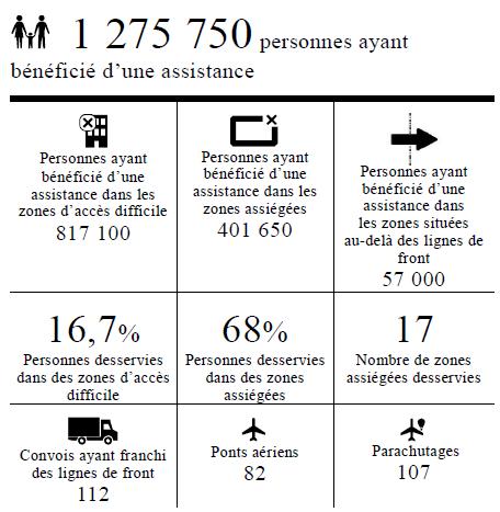 Points essentiels1) Cinq convois interinstitutions ont permis d'apporter une assistance à 189 500 personnes dans le besoin vivant dans deux zones assiégées et huit zones d'accès difficile.