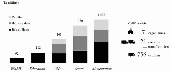 Organisation Nombre de personnes desservies Fonds des Nations Unies pour l'enfance 2 000 000 Fonds des Nations Unies pour la population 384 507 Haut-Commissariat des Nations Unies pour les réfugiés 242 662 Office de secours et de travaux des Nations Unies pour les réfugiés de Palestine dans le Proche-Orient 450 000 Organisation des Nations Unies pour l'alimentation et l'agriculture - Organisation internationale pour les migrations 45 373 Organisation mondiale de la Santé 595 150 Programme alimentaire mondial 4 190 000 Programme des Nations Unies pour le développement 1 200 000 32. Au cours de la période considérée, les livraisons transfrontalières à partir de la Turquie et de la Jordanie à destination de la République arabe syrienne se sont poursuivies en application des résolutions 2165 (2014), 2191 (2014) et 2258 (2015) du Conseil de sécurité (pour plus de détails, voir fig. III). Conformément à ces résolutions, l'ONU a notifié à l'avance chaque livraison aux autorités syriennes, y compris le contenu, la destination et le nombre de bénéficiaires. Le Mécanisme de surveillance de l'aide humanitaire en République arabe syrienne a poursuivi ses opérations, vérifiant 756 camions utilisés pour livrer 21 cargaisons en août, confirmant le caractère humanitaire de chacune de ces cargaisons et notifiant chaque livraison aux autorités syriennes après chaque opération. Il a continué de bénéficier de l'excellente coopération des Gouvernements jordanien et turc.