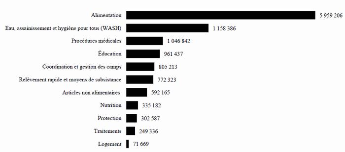 Points essentiels - août 20161) Une aide alimentaire a été fournie à près de 4,19 millions de personnes. Toutefois, seuls 5 % de celle-ci ont pu être acheminés au moyen de convois interorganisations dans les zones assiégées et difficiles d'accès. Cinq convois interorganisations en tout ont été déployés dans 10 zones difficiles d'accès ou assiégées.