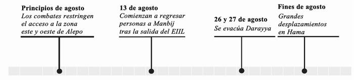 5. El 13 de agosto, después de un estancamiento de 42 días, las Fuerzas Democráticas Sirias, con el respaldo de la coalición de lucha contra el EIIL dirigida por los Estados Unidos, asumieron el control total de la ciudad de Manbij y grandes franjas de tierra en la parte este de la zona rural de Alepo. Tras la partida del EIIL, decenas de miles de desplazados internos regresaron a Manbij, pese a informes de importantes preocupaciones en materia de protección, en particular los altos niveles de contaminación por artefactos explosivos improvisados. Las Naciones Unidas no han podido abrir una vía segura para proporcionar asistencia humanitaria debido a la inseguridad imperante en la región. Cientos de combatientes del EIIL que se vieron obligados a abandonar Manbij se trasladaron a la ciudad de Jarabulus, en la zona rural al norte de Alepo, tomando a aproximadamente 2.000 civiles a los que utilizaron como escudos humanos durante el desplazamiento. Los civiles fueron liberados posteriormente.