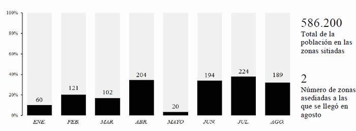 Operaciones interinstitucionales de las Naciones Unidas al otro lado de las líneas de fuego: número de personas asistidas cada mes en las zonas sitiadas22. El acceso a los millones de personas que vivían en zonas sitiadas y de difícil acceso siguió siendo motivo de gran preocupación. Durante todo el mes de agosto, cinco convoyes interinstitucionales alcanzaron a un total de 189.500 personas necesitadas en diez zonas sitiadas y de difícil acceso. Esta cifra representa el 37% de los aproximadamente 506.000 beneficiarios aprobados en el marco del plan de agosto, y aproximadamente el 19% del total de 991.050 personas solicitado en el plan (véase en el párrafo 26 del presente documento una sinopsis del plan de agosto). Además de la asistencia que siguen prestando las Naciones Unidas a esas zonas (resaltadas en el cuadro 2), las organizaciones no gubernamentales siguieron proporcionando servicios limitados en los ámbitos médico, educativo y de protección, así como cierto apoyo en otros sectores, en lugares de difícil acceso y en circunstancias sumamente arduas.