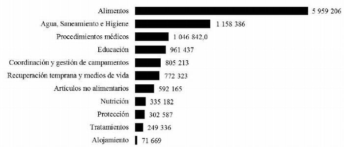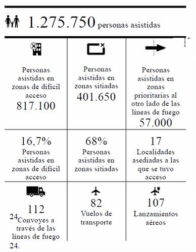 Aspectos destacados en agosto de 20161) Se proporcionó asistencia alimentaria a unos 4,19 millones de personas. Sin embargo, solo se pudo entregar el 5% de esa asistencia mediante convoyes interinstitucionales a lugares sitiados y de difícil acceso. Se desplegó un total de cinco convoyes interinstitucionales a diez lugares de difícil acceso y sitiados.