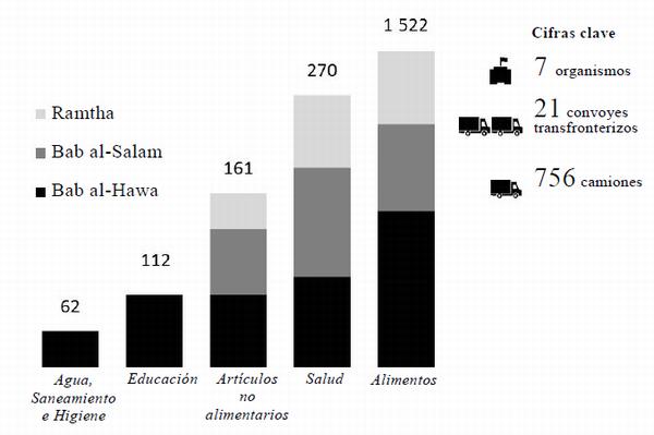Organización Número de personas asistidas Organización de las Naciones Unidas para la Alimentación y la Agricultura — Organización Internacional para las Migraciones 45 373 Oficina del Alto Comisionado de las Naciones Unidas para los Refugiados 242 662 Fondo de las Naciones Unidas para la Infancia 2 000 000 Programa de las Naciones Unidas para el Desarrollo 1 200 000 Fondo de Población de las Naciones Unidas 384 507 Organismo de Obras Públicas y Socorro de las Naciones Unidas para los Refugiados de Palestina en el Cercano Oriente 450 000 Programa Mundial de Alimentos 4 190 000 Organización Mundial de la Salud 595,150 32. Durante el período sobre el que se informa continuaron las entregas a través de las fronteras desde Turquía y Jordania a la República Árabe Siria, conforme a lo dispuesto en las resoluciones 2165 (2014), 2191 (2014) y 2258 (2015) (véase el gráfico III para más detalles. De conformidad con lo dispuesto en las resoluciones del Consejo de Seguridad, las Naciones Unidas notificaron a las autoridades sirias antes de cada envío, e incluyeron información sobre el contenido, el destino y el número de beneficiarios. El Mecanismo de Vigilancia de las Naciones Unidas para la República Árabe Siria prosiguió sus operaciones, supervisó 756 camiones para entregar 21 remesas en agosto, confirmó el carácter humanitario de todas ellas y notificó a las autoridades de Siria al respecto después de cada envío. El Mecanismo siguió disfrutando de una cooperación excelente con los Gobiernos de Jordania y Turquía.